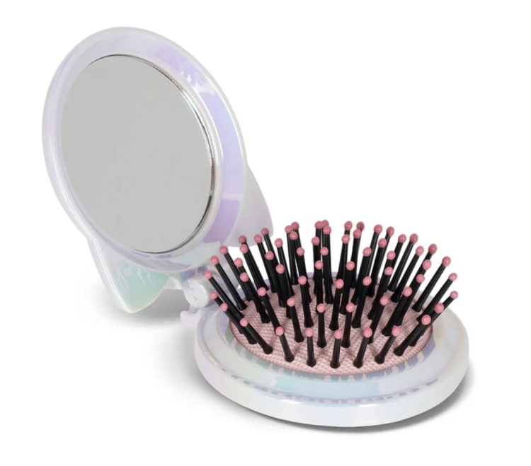 Oglindă compactă cu perie de păr incorporată.