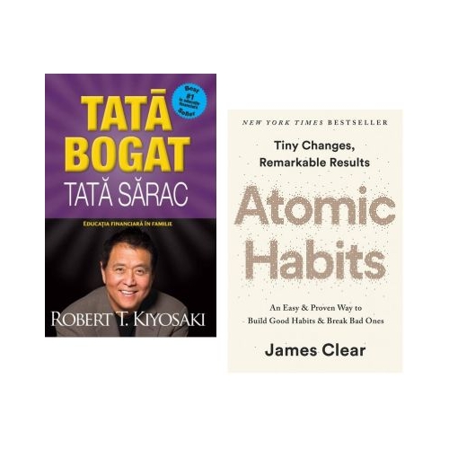 Atomic Habits - James Clear O cale usoara si eficienta de a-ti forma obiceiuri bune si a scapa de cele proaste. Schimbari mici rezultate remarcabile. O carte extrem de practica si utila. James Clear extrage informatiile fundamentale despre formarea obiceiurilor astfel ca tu sa poti realiza mai mult concentrandu-te pe mai putine lucruri. Mark Manson autorul bestsellerului Arta subtila a nepasarii James Clear a petrecut ani de zile perfectionand arta si studiind stiinta obiceiurilor. Aceasta carte antrenanta si practica este ghidul de care ai nevoie ca sa scapi de deprinderile proaste si sa-ti formezi unele bune. Adam Grant autorul bestsellerurilor Originalii si Option B. Inspirandu-se din cele mai noi descoperiri din biologie psihologie si neurostiinte James Clear a conceput un ghid usor de asimilat cu ajutorul caruia obiceiurile bune devin inevitabile iar cele rele imposibile. Invata sa-ti construiesti un sistem pentru a deveni cu 1 mai bun in fiecare zi sa renunti la obiceiurile rele si sa le pastrezi pe cele bune sa eviti greselile comise in general de cei care incearca sa-si schimbe obiceiurile sa depasesti lipsa de motivatie si de vointa sa-ti dezvolti o identitate mai puternica si sa crezi in tine insuti sa-ti faci timp pentru noile obiceiuri chiar si cand viata o ia razna sa-ti concepi un mediu care sa favorizeze succesul sa faci schimbari mici usoare care ofera rezultate mari sa-ti revii atunci cand te abati de la drum si cel mai important cum sa aplici aceste idei in viata reala si multe altele Indiferent daca e vorba de o echipa care incearca sa castige un campionat o organizatie care spera sa redefineasca o industrie sau pur si simplu un om care vrea sa se lase de fumat sa slabeasca sa reduca stresul ori sa realizeze orice alt obiectiv Atomic Habits este solutia. Nu ma consider un expert si nu detin toate raspunsurile dar sunt fericit sa impartasesc ceea ce am invatat pana acum. James Clear O carte deosebita care iti va schimba felul in care iti organizezi ziua si iti traiesti viata. Ryan Holiday autorul bestsellerurilor The Obstacle is the Way si Ego is the Enemy In Atomic Habits Clear iti va arata cum sa depasesti lipsa de motivatie cum sa schimbi mediul inconjurator ca sa incurajezi succesul si cum sa-ti faci timp pentru obiceiuri noi si mai bune. Glamour. com Cartea lui James Clear a fost prezentata in New York Times Time Entrepreneur precum si in emisiunea CBS This Morning si este predata in universitatile din toata lumea. Site-ul sau jamesclear. com are milioane de vizualizari in fiecare luna si sute de mii de persoare se aboneaza la newsletter. El este creatorul The Habits Academy principala platforma de training pentru organizatiile si persoanele interesate in formarea de obiceiuri mai bune in viata si in munca. Sfaturile din Atomic Habits sunt urmate si de antrenorii si jucatorii din NBA si NFL. Tata bogat tata sarac. Educatia financiara in familie. Editia a V Cartea Tata bogat tata sarac a lui Robert Kiyosaki este elaborata in jurul educatiei pe care autorul a primit-o in copilarie de la tatal sau si de la tatal unui prieten oameni profund diferiti din punct de vedere al conceptiilor despre viata si bani. Amandoi l-au influentat definitiv dar in moduri distincte primul oferindu-i o educatie formala al doilea inoculandu-i idei cu un puternic specific antreprenorial. Situandu-se intr-un conflict de opinii promovate de cele doua tipuri de educatie Robert Kiyosaki si-a consolidat un mod de a vedea lucrurile care l-a ajutat sa puna bazele mai multor companii de succes. Tata bogat tata sarac este construita in jurul a sase lectii fundamentale pe care tatal bogat le-a transmis copilului Robert Kiyosaki lectii aflate in opozitie cu ceea ce a invatat de la tatal sarac dar care l-au ajutat sa inteleaga de ce unii oameni au succes si altii oricat de mult ar munci si s-ar chinui nu reusesc sa-si depaseasca conditia. Banii sunt o forma de putere iar o educatie financiara corespunzatoare ne poate ajuta sa intelegem modul in care actioneaza cum ii facem sa circule liber si cum sa ne construim averea. Tata bogat tata sarac este probabil una dintre cele mai importante carti de educatie financiara care ar putea revolutiona modul in care vedem si percepem banii. Tata bogat tata sarac contesta perspectiva obisnuita pe care oamenii o au asupra banilor si ofera o un ghid de educatie financiara pentru toti cei care nu au primit cunostiintele necesare in timpul scolii. Autorul arunca in aer mitul care spune ca trebuie sa castigi mult ca sa te imbogatesti si ne invata ce si cum sa le spunem copiilor despre bani astfel incat sa aiba succes financiar in viitor. Tata bogat tata sarac este un punct de plecare pentru toti cei care doresc sa detina controlul asupra propriului viitor financiar. USA Today Bestseller international tradus in numeroase limbi cartea ne dezvata de ideea de a lucra pentru bani si ne invata cum sa punem banii sa lucreze pentru noi.