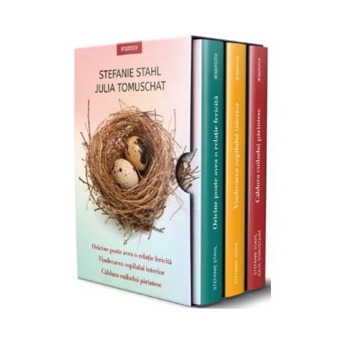 Pachetul contine Vindecarea copilului interior - Stefanie Stahl 272 pagini Oricine poate avea o relatie fericita - Stefanie Stahl 320 pagini Caldura cuibului parintesc. Educa-ti copilul cu blandete si ajuta-l sa devina independent - Stefanie Stahl Julia Tomuschat 256 pagini Vindecarea copilului interior. Renunta la tiparele care aduc nefericire si accepta-te asa cum esti - Anul 2020 Ce-ai zice daca ai afla ca atunci cand doi oameni se cearta de fapt conflictul nu e declansat de doi adulti cu o constiinta de sine solida ci de copiii aflati in fiecare dintre ei Fie ca avem probleme legate de increderea in fortele proprii ne indoim ca partenerul seful sau noua cunostinta ne place cu adevarat sau avem adesea dificultati in a relationa motivul este ca asociem amintiri urate sau chiar traumatice cu perioada copilariei sau poate ca unii dintre noi au avut o copilarie nefericita dar si au reprimat aceste experiente. Dar cum sa ne redobandim increderea Cum sa nu ne mai complacem in mediocritate si sa ne aruncam in viata plini de curaj Psihoterapeuta Stefanie Stahl e de parere ca abia cand vom face cunostinta cu copilul din noi si ne vom imprieteni cu el ne vom da seama ce nazuinte si rani profunde avem in noi. Atunci vom putea accepta aceasta parte ranita a sufletului nostru si o vom vindeca. Astfel increderea in noi insine va creste iar copilul din noi isi va gasi in sfarsit un refugiu. Cu ajutorul exercitiilor practice pe care le propune autoarea iti vei vindeca ranile sufletesti iti vei descoperi resursele si vei gasi raspunsurile la intrebarile pe care ti le-ai pus intotdeauna. Pentru ca meritam cu totii sa ne simtim protejati in siguranta si doriti sa avem relatii mai bune si sa ne simtim impliniti. Oricine poate avea o relatie fericita. Gaseste echilibrul dintre apropierea de celalalt si libertatea personala - Anul 2021 Care e reteta unei relatii fericite Raspunsul e surprinzator de simplu echilibrul dintre atasamentul de celalalt si independenta personala. Intreaga viata si toate relatiile noastre se bazeaza pe cautarea acestei armonii intre nevoia de legaturi umane si autonomie. Intr-o relatie trebuie sa renuntam la o parte din libertatea personala pentru a fi independenti trebuie sa renuntam la o parte din relatie. Pentru multi oameni totusi echilibrul acesta nu exista sunt fie prea implicati fie prea detasati. Odata ce intelegem mecanismele care strica sau impiedica acest echilibru si ne dam seama cum sa-l atingem sau sa-l restabilim nu va mai fi nevoie sa speram de exemplu ca partenerul nostru se va schimba sau ca barbatul ori femeia ideala va aparea din senin la usa noastra. Vom crea o relatie in care doi oameni sunt pe picior de egalitate si simt ca au aceleasi valori. Cu stilul ei clar si convingator cu o abordare practica si cu ajutorul indispensabil al copilului nostru interior Stefanie Stahl ne invata sa identificam strategiile defensive pe care le-am invatat de-a lungul anilor si ne prezinta tehnici prin care putem sa renuntam la tiparele comportamentale disfunctionale nocive pentru o relatie fericita. Oricine e capabil sa recunoasca relatiile care nu au sanse de succes si sa traiasca o relatie implinita si de durata. Caldura cuibului parintesc. Educa-ti copilul cu blandete si ajuta-l sa devina independent - Anul 2022 Carte pentru orice parinte care vrea sa-si vada copilul devenind o personalitate puternica si fericita. Parintii de azi trebuie deja sa faca fata unui numar impresionant de indatoriri si cerinte. Cartea de fata nu-si propune sa-i impovareze in plus cu eternele sfaturi pedagogice ci sa le usureze sarcina. Cum anume Indemnandu-i sa reflecteze la relatia cu copiii lor si cu ei insisi. A te intelege mai bine pe tine insuti - de dragul copiilor Cum in zilele noastre aproape ca nu mai exista familii mari si nici copilul nu mai e crescut si educat de un sat intreg parintii si copiii din familia mica sunt intr-o masura mult mai mare ei intre ei iar copiii sunt mai mult ca oricand expusi la toate asperitatile din caracterul parintilor sau al figurii de atasament. Cu atat mai mult conteaza sa fii impacat ca mama sau ca tata cu tine insuti si sa devii constient de propriile convingeri implicite de propriile tipare de gandire si comportament. In felul acesta iti vei putea vedea copiii nu doar prin prisma pretentiilor si nevoilor tale ci le vei putea identifica lor nevoile reale. Aplicand la educatie conceptul copilului interior cele doua autoare psihologe cu experienta iti arata cum poti gasi ca parinte echilibrul dintre a fi atasat de copilul tau si a-l lasa liber cum ii poti da radacini si sustinere daruindu-i in acelasi timp aripi si incredere in sine pentru confruntarea cu lumea. Cu cat parintii reusesc mai bine sa nu se scape din ochi pe ei insisi cu atat mai bine isi pot trage sufletul si le pot fi copiilor parinti buni autentici si iubitori. Nu e vorba atat de A FACE ceva cat mai degraba de A FI mai constient de ceea ce se intampla cu tine si de efectul pe care il ai asupra copilului.