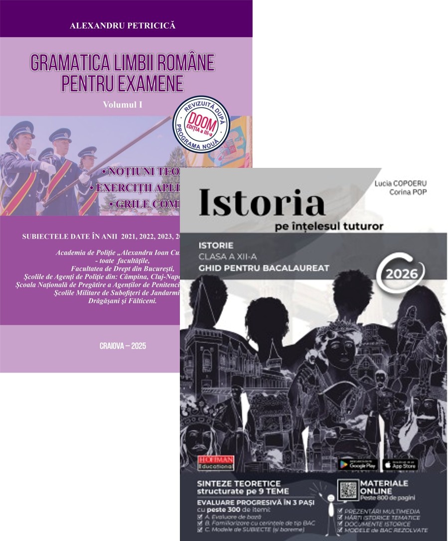 Revizuita dupa noua programa scolara si DOOM 3, cuprinde notiunile teoretice pentru cele patru capitole: Vocabularul, Fonetica, Morfologia si Sintaxa, precum si grile pentru fiecare capitol, care au la sfarsit raspunsurile corecte, dar explicate si comentate pertinent cu reguli punctuale, in limbaj accesibil. Dupa fiecare capitol sunt inserate cele mai des intalnite DIFICULTATI, cu scopul de a atrage atentia asupra problemelor dificile ale fiecarei parti de vorbire sau de propozitie. In acest volum se gasesc subiectele explicate si comentate date in anii 2021, 2022, 2023, 2024 si 2025 la Academia de Politie, Facultatea de Drept Bucuresti, Scolile de Agenti de Politie din Campina, Cluj-Napoca si Oradea, Scolile Militare de Subofiteri de Jandarmi din Dragasani si Falticeni si Scoala Nationala de Pregatire a Agentilor de Penitenciare Targu Ocna.