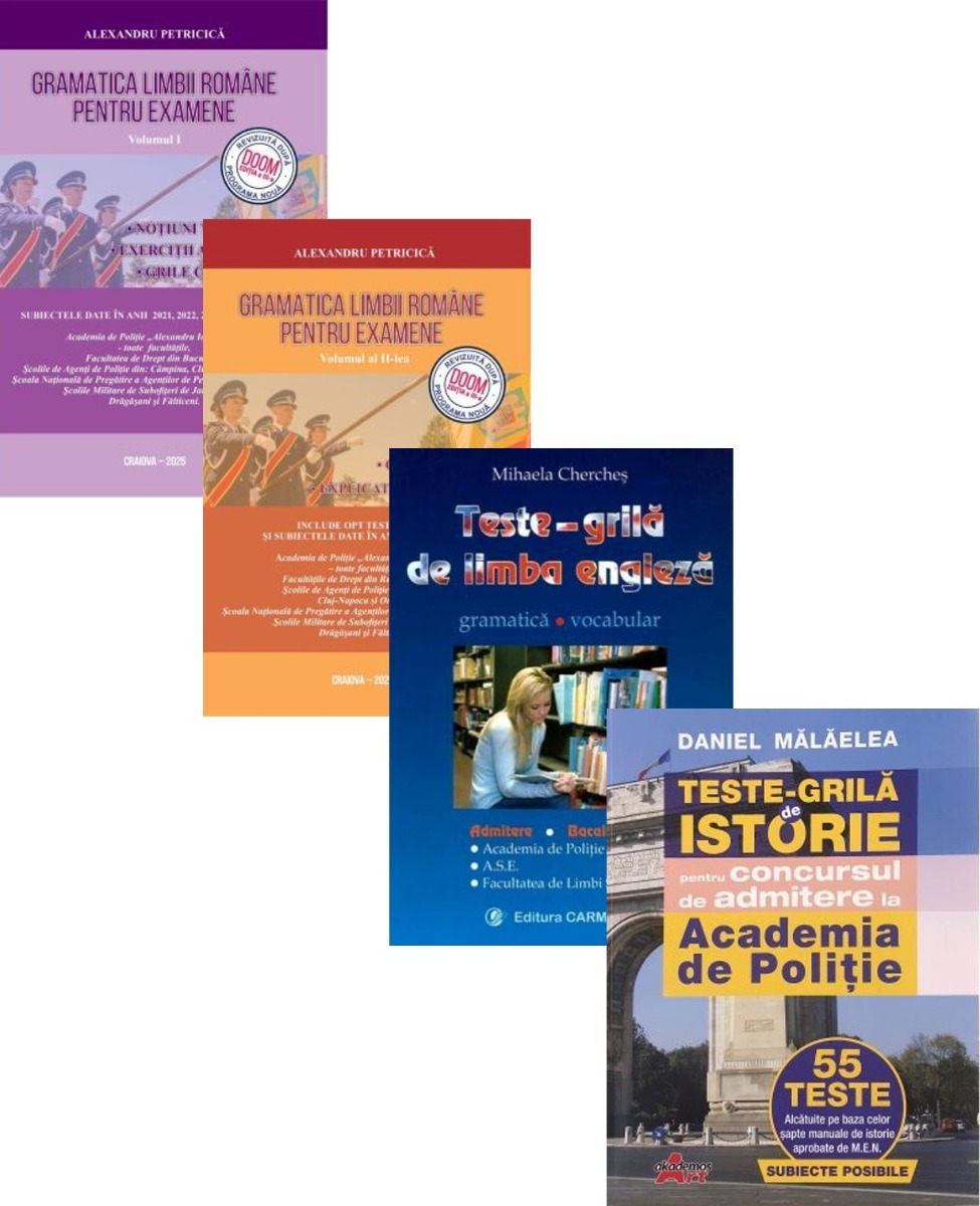 Pachet complet Admitere Academia de Politie Gramatica limbii romane, Notiuni, Exercitii si Grile. Teste grila de istorie Teste grila de limba engleza. Gramatica, vocabular - Alexandru Petricica