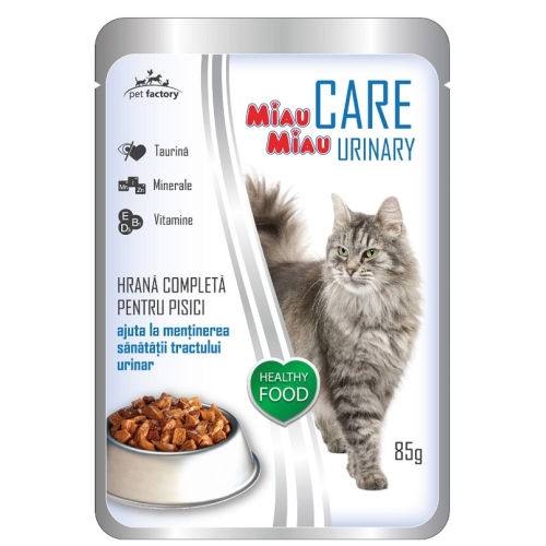 PLICULETELE MIAU MIAU CARE URINARY CU PESTE IN GELATINA 12 x85 g contin o hrana completa cu ficat pentru pisici adulte cu sensibilitate urinara.