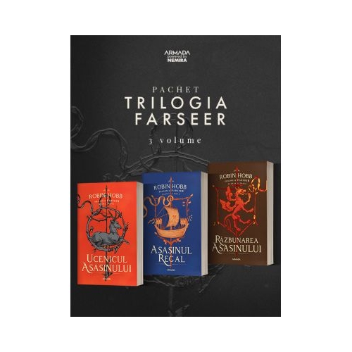 Magie iubire aventuri de capa si spada intrigi politice trilogia FARSEER a inegalabilei Robin Hobb are toate ingredientele unei povesti de succes si ceva pe deasupra talentul unei scriitoare cum nu se nasc multe intr-o generatie. Cu cele trei romane FARSEER Ucenicul asasinului Asasinul regal si Razbunarea asasinului veti patrunde in universul magic numit THE REALM OF THE ELDERLINGS descris si in seriile CORABIILE INSUFLETITE OMUL ARAMIU THE RAIN WILD CHRONICLES si FITZ AND THE FOOL toate aparute sau in curs de aparitie in ARMADA. Pachetul contine titlurile Razbunarea asasinului Asasinul Regal Ucenicul asasinului