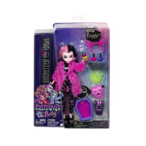 Desigur fiecare petrecere de pijama include rasfat si machiaj... dar adauga cateva carti de vraji si oja si acum vei avea o seara cu adevarat spectaculoasa alaturi de prietenii tai Monster High prezinta seria Creepover Party o colectie de personaje delicioase cu accesorii tematice care inspira crearea de povesti cu jocuri de moda fantastice Fiecare papusa Monster High poarta o tinuta moderna are accesoriile necesare pentru o petrecere de pijama si vine cu un animal de companie adorabil. Fiecare papusa este vanduta separat in functie de disponibilitate. Corp flexibil. Papusa nu poate sta in picioare de una singura.