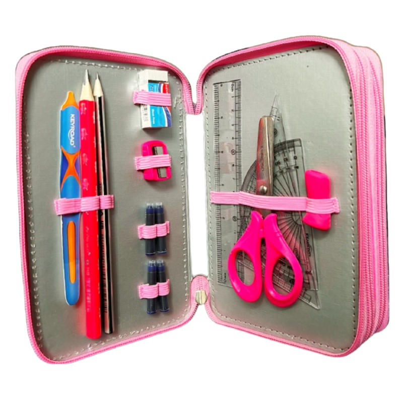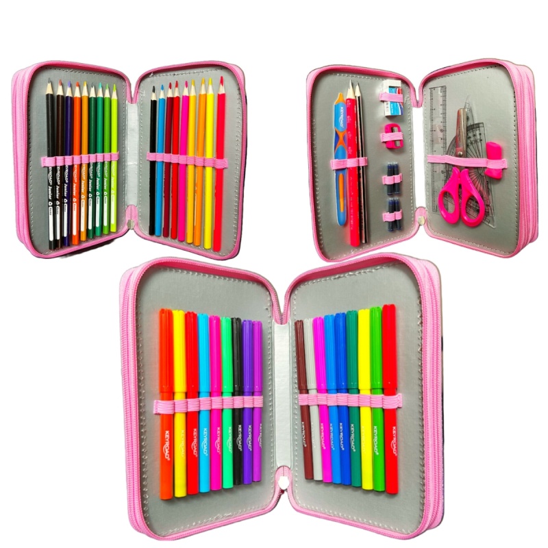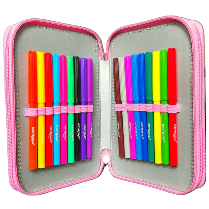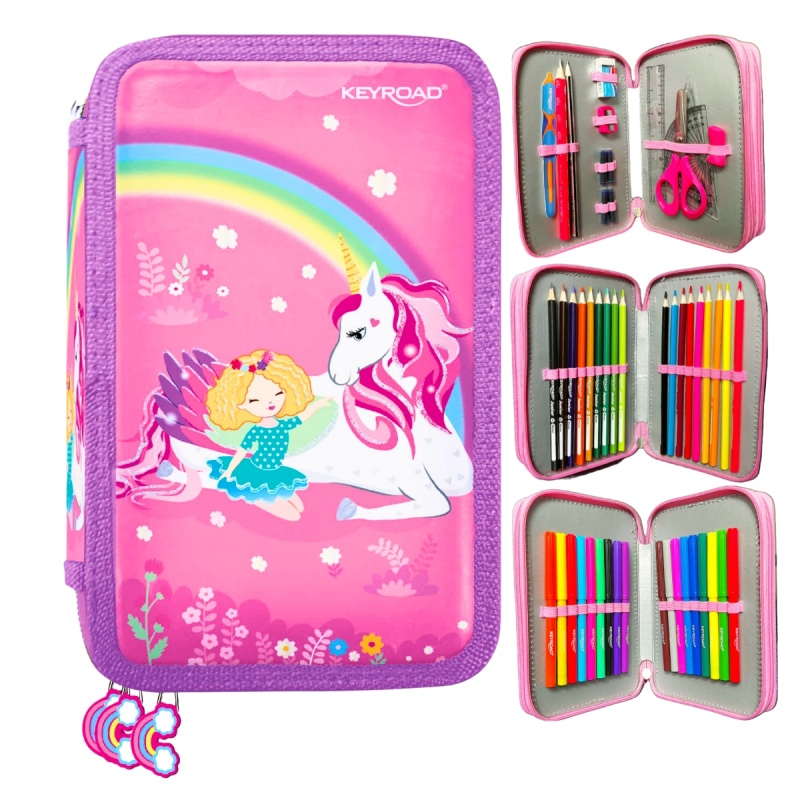 Descoperă penarul echipat Keyroad, cu 3 fermoare, roz, KR971818, un penar ca o casă de păpuși, plin de surprize colorate, perfect pentru micii artiști de la grădiniță și școală! Acest penar este ca o cutie cu comori, având tot ce ai nevoie pentru a desena, colora și scrie, organizat în 3 compartimente cu fermoar, ca să găsești ușor fiecare lucrușor.