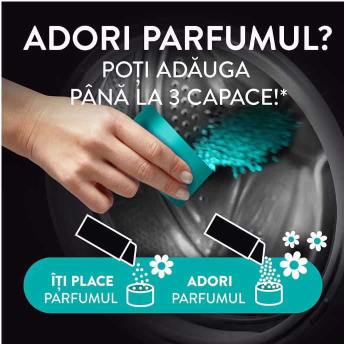 Pentru rezultate optime, adauga perlele direct in cuva goala a masinii de spalat, inainte de a introduce hainele. Poti ajusta cantitatea in functie de preferintele personale de intensitate a parfumului. Pentru o intensitate usoara, foloseste jumatate de capac; pentru o prospetime standard, un capac; iar pentru un parfum intens si de durata, poti adauga pana la trei capace de produs. Nu adauga perlele in compartimentul pentru detergent sau balsam.