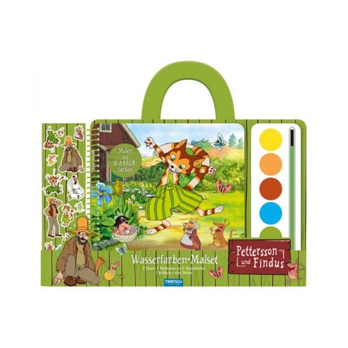 Set de pictura in acuarela „Pettersson und Findus”: Set de 1 pensula, 1 cutie de vopsea cu 6 acuarele, 1 carte de colorat si multe autocolante.