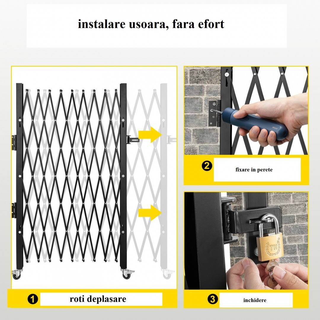 Poarta pliabila acordeon, Vivatechnix Otel, Negru, 2 x roti, Latime extinsa 2159 mm, Inaltime 2413 mm