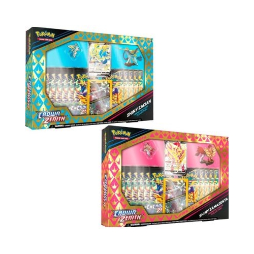 Pokemon TCG SWSH12. 5 Crown Zenith Premium Figure Collection. Contine 11x pachete booster a cate 10 carti 1x carte promotionala din folie gravata cu Shiny Zacian V sau Shiny Zamazenta V 1x figurina 1x insigna 65x folii protectie pentru carti 1x cod virtual pentru Pokemon TCG Live.