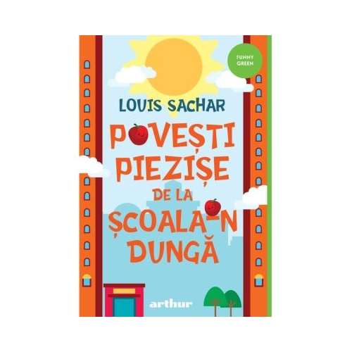In loc sa aiba un etaj si treizeci de clase una dupa alta, are treizeci de etaje cu cate o clasa pe fiecare nivel. Constructorul a spus ca-i pare rau. Copiilor de la Scoala-n Dunga le place sa aiba o scoala piezisa. Au un teren de joaca neinchipuit de mare...