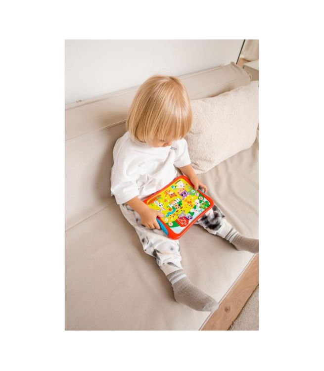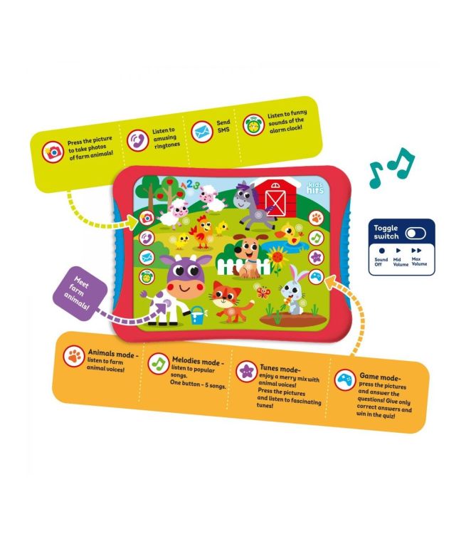 Sunetele si melodiile fascinate, ilustratiile stralucitoare si functia,, apasa'' stimuleaza toate simturile copiilor si ii ajuta sa avanseze in procesul de invatare.