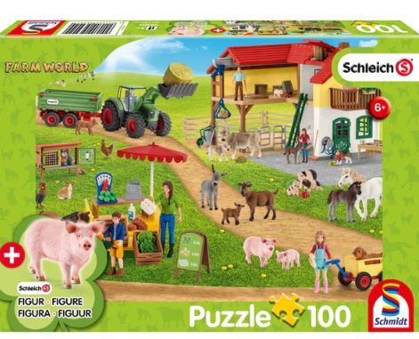 Puzzle Schmidt: Schleich - Ferma si piata, contine 100 piese de puzzle + Cadou figurina animal. In acest puzzle regasim locul unde se desfasoara agricultura, ferma, respectiv desfacerea acestuia piata unde se vand produsele obtinute din agricultura.