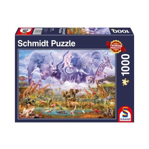 Puzzle Schmidt: Animale la adapat contine 1000 de piese de puzzle. Descopera lumea animalelor intr-un mod putin mai diferit. In acest puzzle veti putea recunoaste mai multe animale salbatice: elefant, girafa, leu, rinocer, ghepard, zebra, hipopotam.