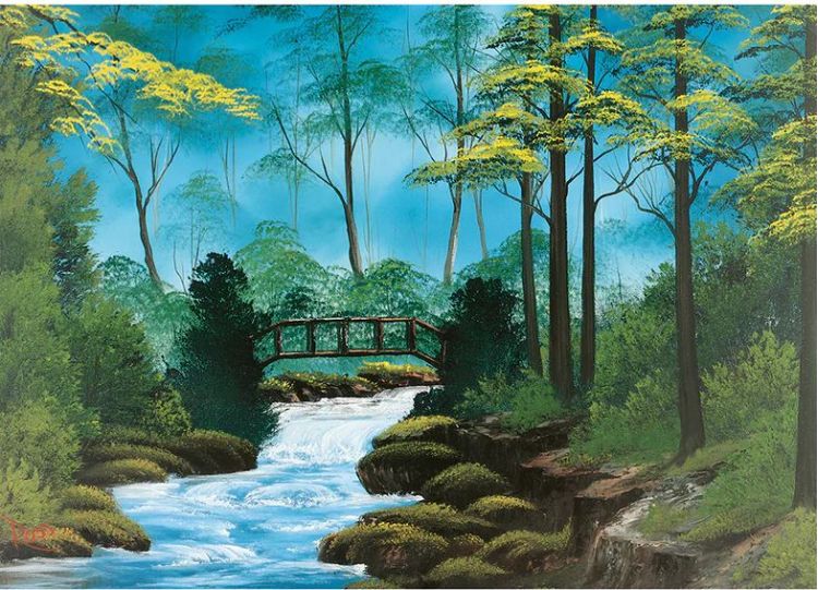 Descopera linistea naturii cu 'Podul izolat' de Bob Ross – un peisaj fermecator cu paduri, ape linistite si un pod rustic, plin de detalii relaxante.