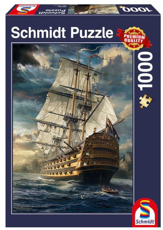 Puzzle Schmidt: Corabia, 1000 piese -dupa cum vedem din imagini, observam o corabie imensa, care isi ridica panzele, isi asteapta soldatii si e gata de plecare. Este cel mai probabil o corabie a armatei engleze, nu este o corabie de pirati… Ridicam ancora, panzele sus si pornim la drum... Va invitam sa descoperiti aceasta corabie de lupta, pas cu pas rezolvand acest puzzle minunat!