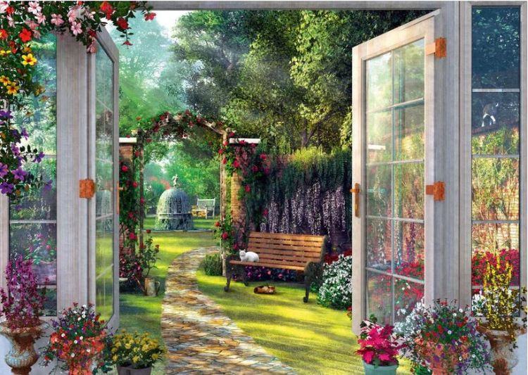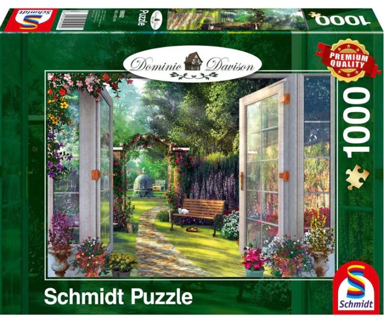 Puzzle Schmidt: Dominic Davison- Vedere spre gradina fermecatoare, contine 1000 de piese de puzzle. Cat de frumoasa este vederea din casa spre o curte aranjata si ingrijita. Elementele principale ale acestui puzzle minunat sunt: usile albe, mari si care lasa lumina sa intre cu usurinta in casa; curtea ingrijita si plin de verdeata; iesirea plina cu flori cu o multime de culori, respectiv fantana arteziana din mijlocul curtii!