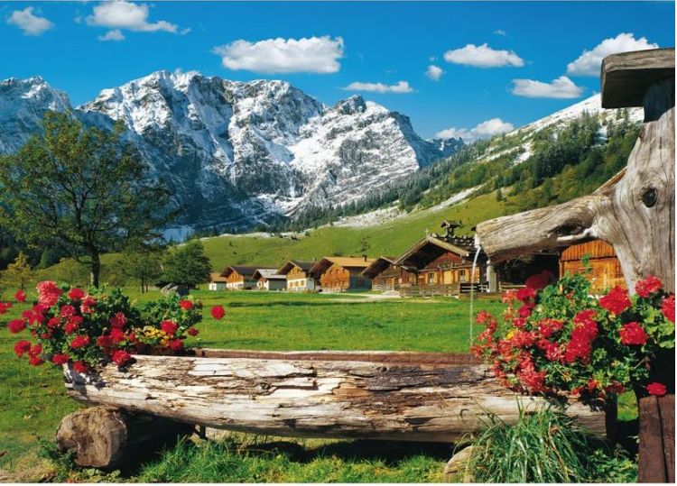 Puzzle Schmidt: Paradis la munte contine 1000 de piese de puzzle. Paradisul este un loc complet si minunat! Acest puzzle prin frumusetea ei se aseamana cu paradisul: cabane situate la poalele muntilor acoperite de zapada, iar in apropiere se afla un aranjament floral intr-un trunchi de copac sculptat.