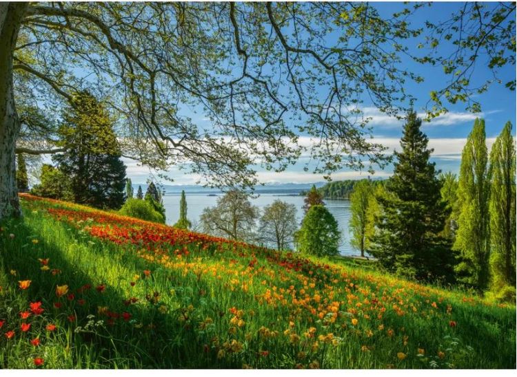 Puzzle Schmidt: Primavara cu lalele inflorite, Insula Mainau contine 1000 de piese de puzzle. Pe insula Mainau unde primavara este eterna, care se mai numeste si insula florilor. Descopera lalelele minunate de pe acest camp cu ajutorul acestui puzzle minunat!