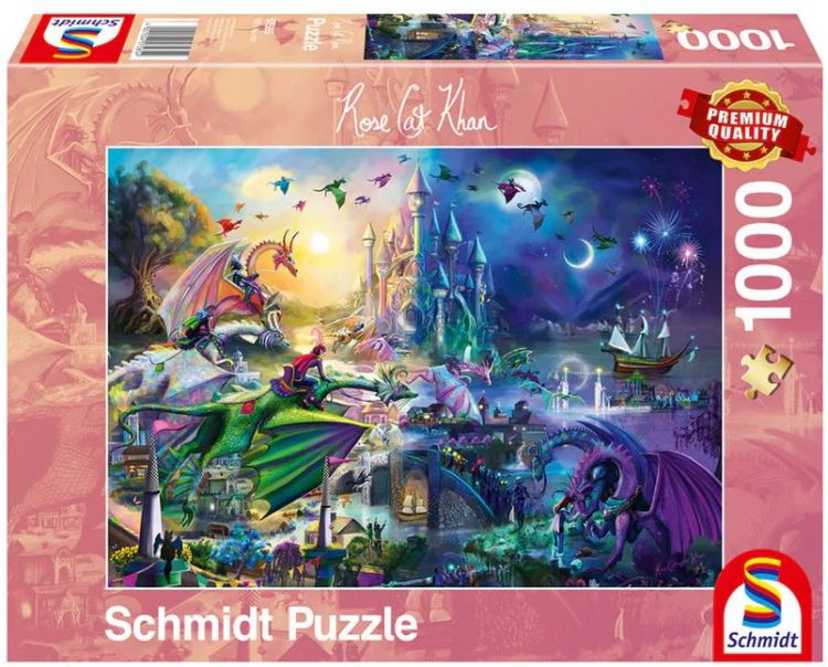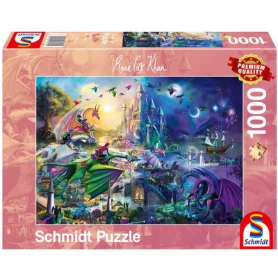 Puzzle Schmidt: Rose Cat Khan - Competitia nocturna a dragonilor - contine 1000 piese de puzzle. Prezentul puzzle infatiseaza o scena fantastica a unei curse de dragoni pe timp de noapte. Cerul noptii este cuprins de o explozie de culoare, accentuata de focul dragonilor.