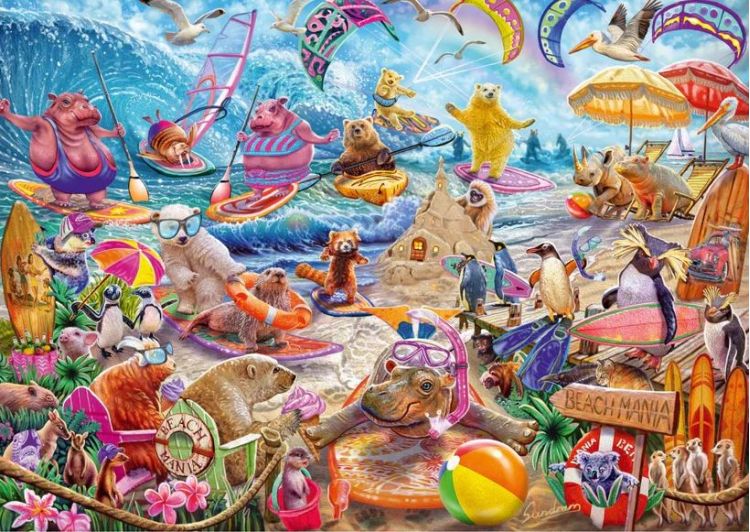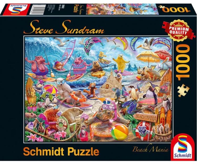 Puzzle Schmidt: Steve Sundram - Secret Puzzles- Beach Mania contine 1000 de piese de puzzle. Cum reactionezi atunci, cand in concediul mult asteptat iesi pe plaja la mare, dar gasesti o multime de animale salbatice in loc de oameni relaxati? Te vei enerva sau alegi sa rezolvi acest puzzle cu adevarat salbatic?!