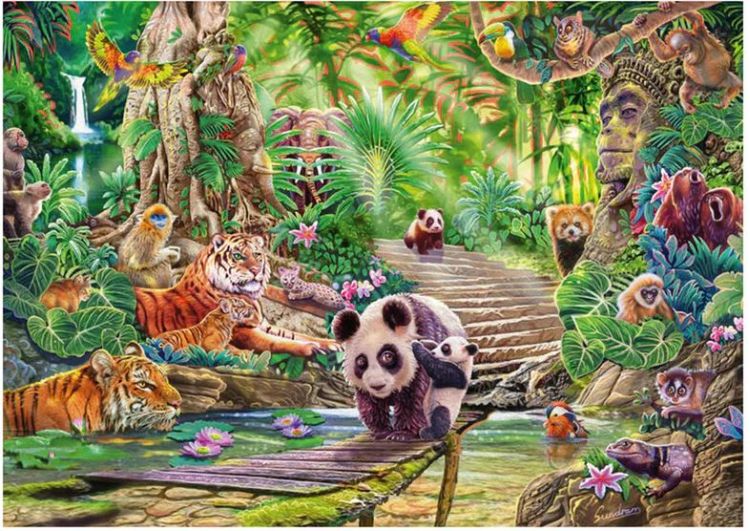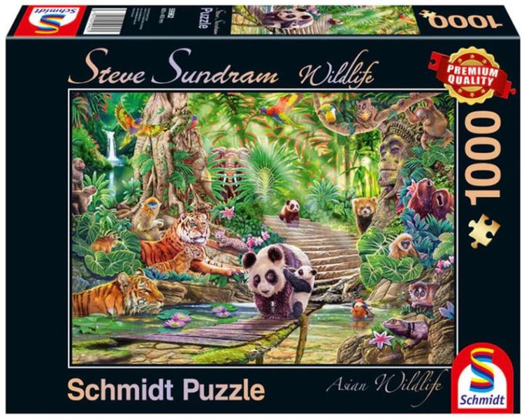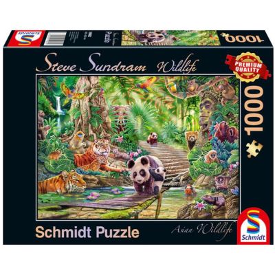 Puzzle Schmidt: Steve Sundram - Lumea salbatica a Asiei contine 1000 de piese de puzzle. Acest puzzle prezinta viata din salbatica a Asiei intr-un mod foarte dragalas. O ilustratie minunata despre cele mai reprezentative animale din aceasta zona: elefant, maimuta, tigru, panda etc. Te invit sa descoperi un puzzle cu animale salbatice intr-un mod atat de prietenos!
