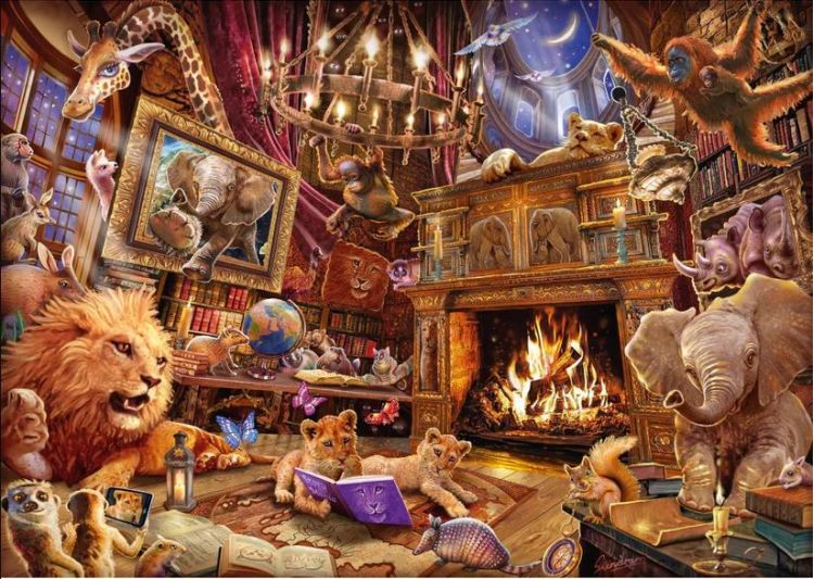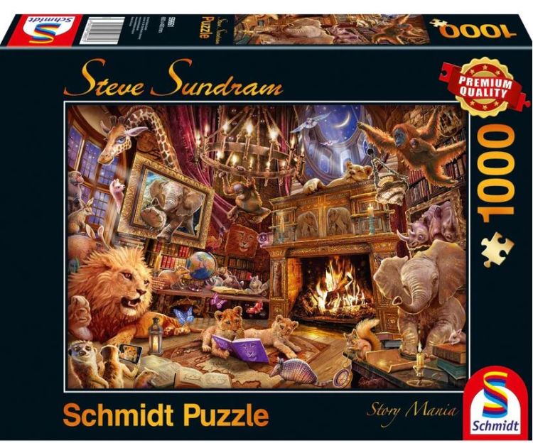 Puzzle Schmidt: Steve Sundram - Secret Puzzles- Story Mania contine 1000 de piese de puzzle. Ce se intampla cand in livingul caminului tau, langa semineu in loc de oameni se afla cateva animale salbatice, care citesc o carte, se relaxeaza sau se distreaza. Printre animale gasesti: elefanti, lei, maimute, girafe etc. Cum vei gestiona aceasta situatie? Te vei enerva sau mai bine te apuci si vei rezolva acest puzzle salbatic, dar totusi linistit!