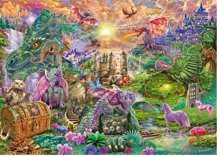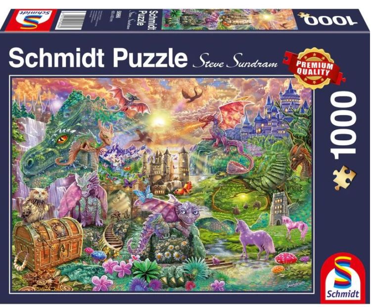 Puzzle Schmidt: Taramul dragonului fermecat contine 1000 de piese de puzzle. Undeva departe pe un taram necunoscut se afla Castelul Dragonului Fermecat. Incearca sa descoperi toate elementele acestui puzzle! In acest puzzle veti gasi mai multe dragoane, castele, comori si alte elemente magice.