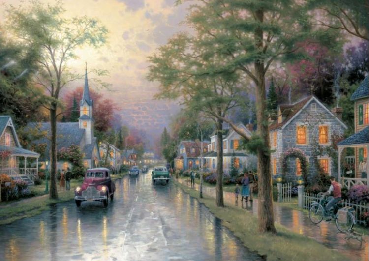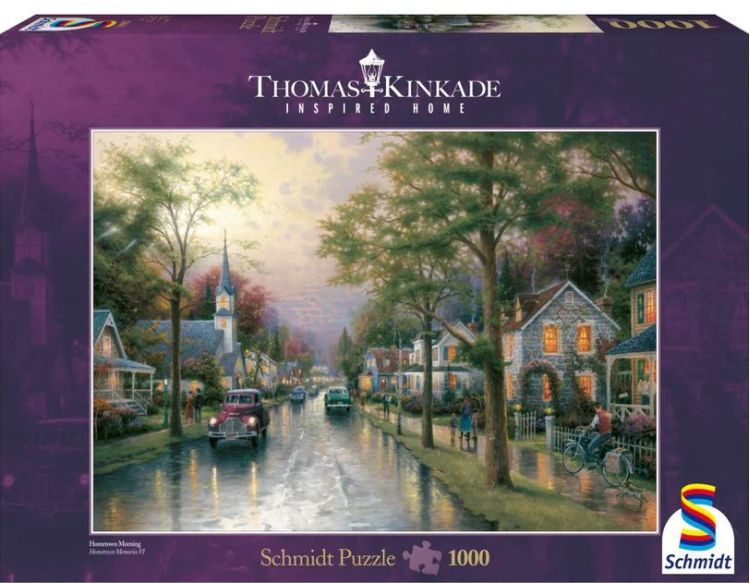 Puzzle Schmidt: Thomas Kinkade - Dimineata intr-un orasel contine 1000 de piese de puzzle. Puzzle-ul ilustrat de catre Thomas Kinkade ne prezinta un oras linistit cu o multime case insirate, cu masini parcate langa case, un biciclist singuratic si cativa pietoni care se feresc de ultimele stropi de ploaie. Descoperiti detaliile acestui puzzle minunat, rezolvandu-l pas cu pas!