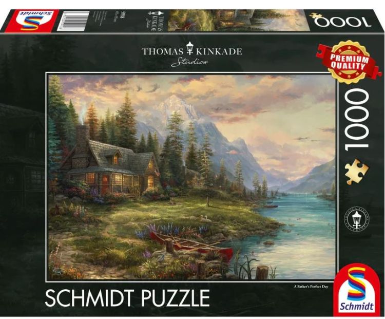 Puzzle Schmidt: Thomas Kinkade - Excursie de Ziua tatalui contine 1000 de piese de puzzle. Tu ce destinatie ti-ai alege pentru Ziua tatalui, impreuna cu parintele tau drag? Ce zici de o destinatie mirifica la poalele muntilor? Locatia speciala va fi o casuta intre o padure si un rau lin, unde vei putea pescui cu ajutorul unei barci cu vasle impreuna cu tatal tau. Te bagi? Daca inca nu dispui de banuti pentru o calatorie de genul acesta, te invit sa descoperi impreuna cu tatal tau puzzle-ul minunat ilustrat de catre Thomas Kinkade, un cadou ideal pentru aceasta ocazie!