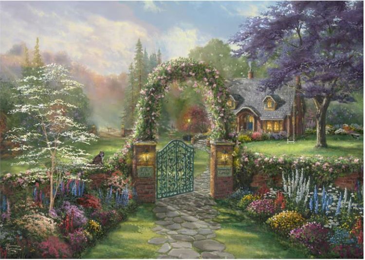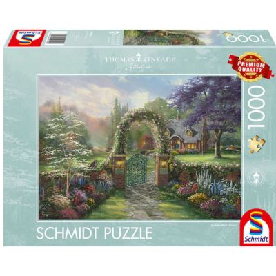 Puzzle Schmidt: Thomas Kinkade -Hummingbird Cottage contine 1000 de piese de puzzle. Te invitam intr-un peisaj special parca scos din basmele povestite de bunicii nostri. Proprietatea din imagine te intampina cu un gard viu ilustrat cu culori atent alese. In departare gasim o casa care sugereaza caldura si dragoste pentru primirea oaspetilor. Descopera peisajul mirific din aceasta imagine!