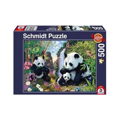 Puzzle Schmidt: Familia panda la cascada, 500 piese- inaceasta imagine plin de culori, putem observa o familie de ursi panda rontaind bambus printre numeroasele flori si fluturi colorati din padure.
