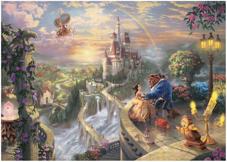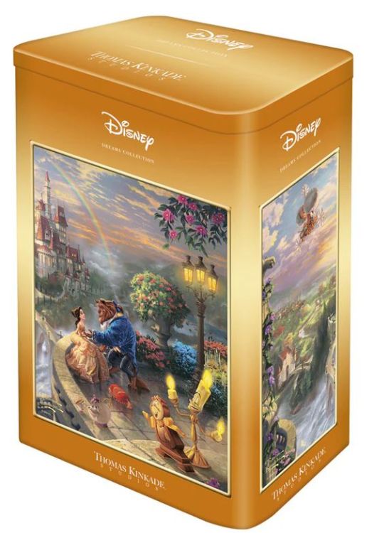 Puzzle Schmidt: Thomas Kinkade - Disney - - Frumoasa si Bestia indragostindu-se, 500 piese, cutie metalica - este un film de animatie din 1991, lansat initial de catre Walt Disney Pictures. Frumoasa este o fata nemultumita de viata dintr-un orasel provincial al Frantei, care incearca sa respinga dovezile de afectiune ale ingamfatului Gaston. Bestia este un prin transformat într-un animal fioros printr-o vraja pentru ca nu putea sa iubeasca. Destinele celor doi se intalnesc. Pentru a rupe vraja, Bestia trebuie sa-i castige dragostea frumoasei fete, altfel risca sa ramana asa pentru totdeauna.