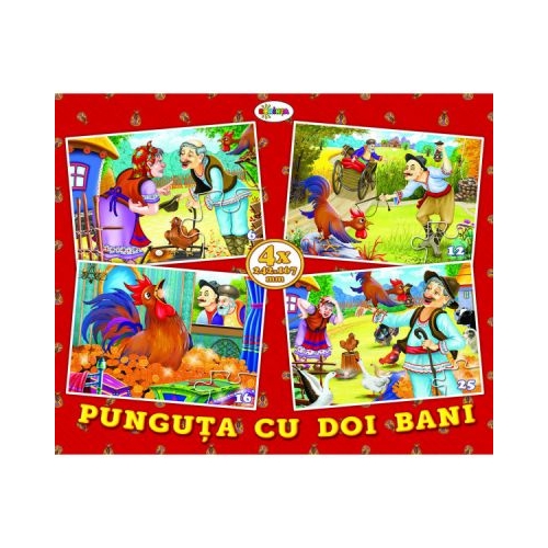 Asambleaza puzzle-ul "Punguta cu doi bani" si descopera in cele 4 imagini povestea, iar pe verso vei gasi un fragment din poveste.
