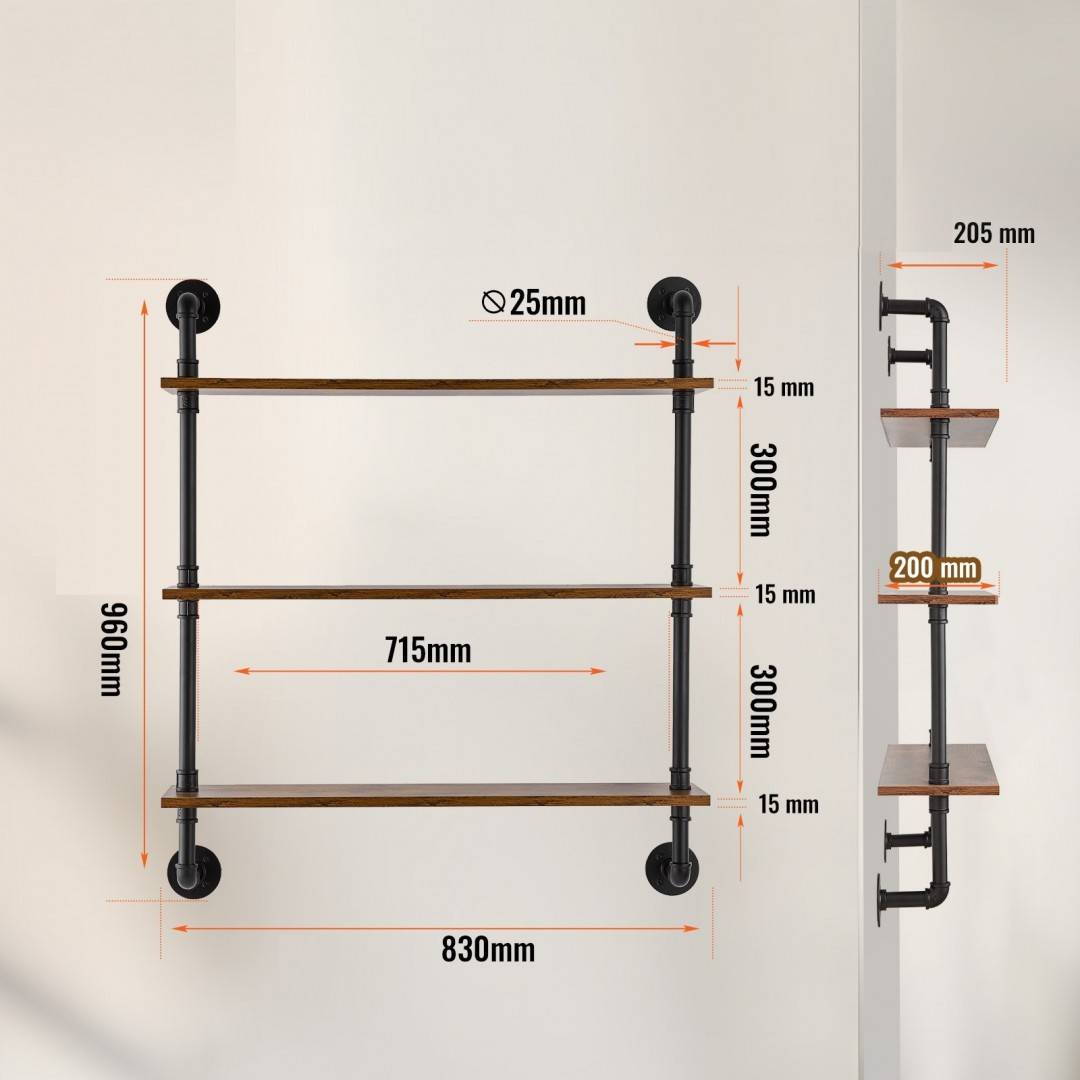 Raft metalic cu 3 x polite incluse din lemn, Vivatechnix Industrial, 830 x 205 x 960 mm