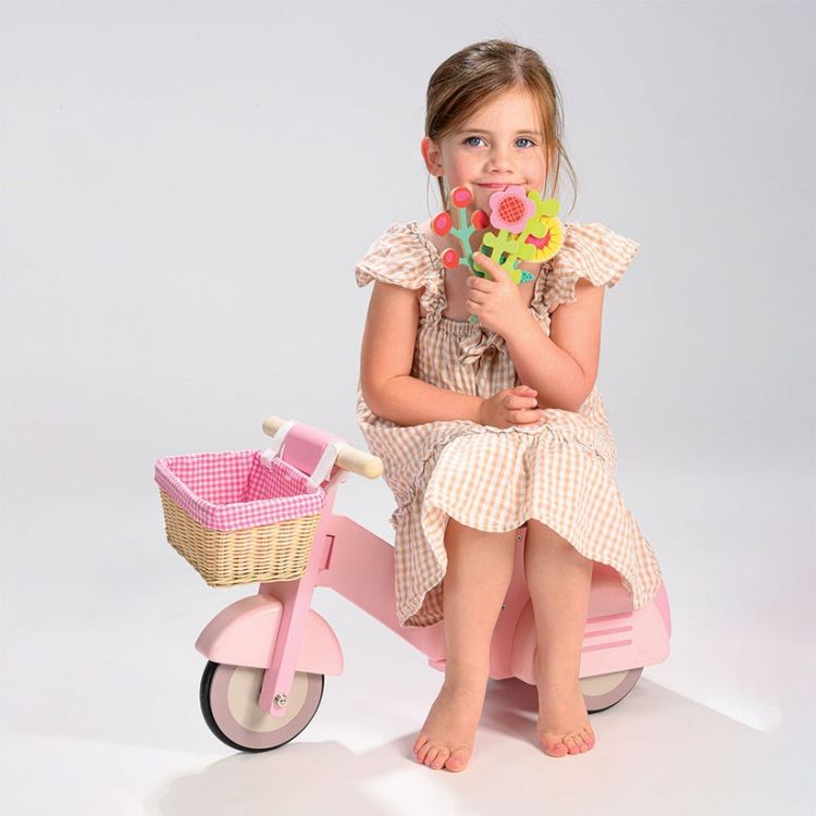 Un scuter adorabil, intr-o nuanta superba de roz! Cosuletul impletit, captusit cu material roz in carouri, este perfect pentru a transporta cumparaturile sau jucaria preferata. Cosuletul este prins cu benzi albe detasabile. Setul include si o serie de autocolante colorate pentru personalizare! Ideal pentru jocuri de rol si pentru dezvoltarea abilitatilor sociale si de comunicare.