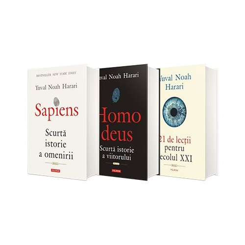 Serie autorului Yuval Noah Harari este compunsa din trei titluri - Sapiens. Scurta istorie a omenirii de Yuval Noah Harari - Homo Deus. Scurta istorie a viitorului - Yuval Noah Harari - 21 de lectii pentru secolul XXI Sapiens. Scurta istorie a omenirii Acum 100. 000 de ani pe pamint existau cel putin sase specii de oameni. Astazi exista una singura noi Homo sapiens. Ce s-a intimplat cu celelalte Si cum am ajuns sa fim stapinii planetei De la inceputurile speciei noastre si rolul pe care l-a jucat in ecosistemul global pina in modernitate Sapiens imbina istoria si stiinta pentru a pune in discutie tot ce stim despre noi insine ne arata cum ne-am unit ca sa construim orase regate si imperii cum am ajuns sa credem in zei in legi si in carti dar si cum am devenit sclavii birocratiei ai consumerismului si ai cautarii fericirii. De asemenea ne indeamna sa privim in viitor caci de citeva decenii am inceput sa incalcam legile selectiei naturale care au guvernat viata in ultimii patru miliarde de ani. Dobindim capacitatea de a modela nu doar lumea din jurul nostru ci si pe noi insine. Incotro ne duce aceasta si ce vrem sa devenim Interesanta si provocatoare... Ne ajuta sa intelegem de cit de putin timp sintem pe acest pamint de cit de putin timp exista lucruri ca agricultura sau stiinta si de ce este bine sa nu le luam ca pe ceva de la sine inteles. Barack Obama Sapiens abordeaza cele mai mari probleme ale istoriei si ale lumii moderne fiind scrisa intr-o limba plina de viata. Jared Diamond O istorie a civilizatiei captivanta provocatoare... combinata cu o gindire nonconformista si fapte uimitoare. Aceasta carte fascinanta si distrugatoare de mituri nu poate fi rezumata... pur si simplu trebuie s-o citesti. Financial Times In aceasta analiza exhaustiva a istoriei oamenilor Harari le ofera cititorilor ocazia sa reconsidere totul de la supravietuirea lui Homo sapiens pina la fascinanta chestiune a modului in care societatea se organizeaza prin fictiuni. Booklist Sapiens ii poarta pe cititori intr-un tur rapid al istoriei speciei noastre... o lectura importanta pentru un sapiens cu preocupari serioase care reflecteaza asupra lui insusi. The Washington Post Traducere de Adrian Serban Bestseller New York Times Publicata initial in Israel in 2011 Sapiens a devenit rapid bestseller international fiind tradusa in peste patruzeci de limbi. Colectie HISTORIA Tip editie cartonata Numar pagini 384 Format 160x235 An aparitie 2017 Homo Deus. Scurta istorie a viitorului Traducere de Lucia Popovici Sapiens ne-a aratat de unde venim. Homo deus ne arata incotro ne indreptam. De-a lungul istoriei omenirea s-a confruntat constant cu trei probleme cruciale razboiul foametea si molimele. In secolul XX a reusit sa le rezolve in mare masura. Razboiul nu mai are aceeasi putere de distrugere in prezent numarul celor care se sinucid e mai mare decit al celor morti in conflicte armate. Foametea dispare oamenii sufera mai degraba din cauza obezitatii decit din cauza malnutritiei. Molimele nu mai fac ravagii mai multi oameni mor de batrinete decit in urma bolilor infectioase. Ce anume va lua insa locul razboiului foametei si molimelor in agenda omenirii Ce destin vom alege pentru noi insine ce scopuri ne vom stabili Yuval Noah Harari exploreaza proiectele visurile si cosmarurile care ne vor marca viitorul. Omul va incerca sa devina asemenea zeilor invingind moartea si creind viata artificiala. Este chiar urmatorul stadiu al evolutiei Homo deus. O carte remarcabila cu perspective si reinterpretari profunde ale lucrurilor pe care credeam ca le stim despre noi si despre istoria noastra. O carte foarte inteligenta plina de observatii patrunzatoare si ironie muscatoare... O carte neobisnuita o carte cool. The Guardian Asemenea marilor epopei Sapiens avea nevoie de o continuare. Aceasta este Homo deus in care viitorul dupa toate probabilitatile apocaliptic este imaginat in detaliu. E un scenariu fascinant al nenumaratelor moduri in care am putea sa dam gres din cauza ca vrem prea mult. The Observer O carte extraordinara... Nu doar schimba felul in care vezi lumea dupa ce o citesti ci infatiseaza trecutul intr-o lumina diferita. Mail on Sunday Provocatoare... Opera unui ginditor inzestrat. The New York Times Harari are abilitatea de a condensa memorabil mari idei si de a le imbina cu umorul. El ne ofera nu doar lectii de istorie ci o lectie de metaistorie. The Washington Post Istoria a inceput cind oamenii au inventat zeii si se va sfirsi cind oamenii vor deveni zei. Yuval Noah Harari Numar pagini 392 ISBN 978-973-46-7199-1 Tip editie cartonata Format 160x235 An aparitie 2018 21 de lectii pentru secolul XXI Intr-o lume invadata de informatii irelevante claritatea inseamna putere. In locul mai vechii cenzuri care presupunea blocarea fluxului de informatii astazi oamenii sint asaltati cu dezinformari si lucruri care sa le distraga atentia. 21 de lectii pentru secolul XXI face lumina in privinta unora dintre cele mai presante probleme de pe agenda globala actuala. Cum facem fata epidemiei de stiri false Mai sint relevante natiunile si religiile Ce ar trebui sa-i invatam pe copiii nostri De ce trece democratia liberala printr-o criza Este iminent un nou razboi mondial Ce inseamna ascensiunea lui Donald Trump Ce civilizatie domina lumea Occidentul China islamul Europa ar trebui sa-si deschida portile imigrantilor Poate nationalismul sa rezolve problemele legate de inegalitate si de schimbarea climatica Ce ar trebui sa facem in privinta terorismului Povestea liberala pretuieste libertatea omului considerand-o valoarea suprema. Ea sustine ca orice autoritate izvoraste in definitiv din libe-rul-arbitru al inizilor asa cum se manifesta acesta in sentimentele dorintele si alegerile lor. in politica liberalismul considera ca alegatorul stie cel mai bine. Prin urmare sustine alegerile democratice. 1n econo-mie liberalismul sustine ca clientul are intotdeauna dreptate. De aceea glorifica principiile pietei libere. in chestiunile personale libera