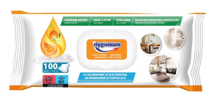 Servetele umede universale Hygienium, 100 buc, 23x21, 5 cm, cu bicarbonat si ulei esential de mandarina si portocala