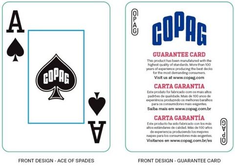 Un pachet are spatele de culoare rosie si celalalt are spatele de culoare neagra. Intr-un pachet se gasesc 52 carti de joc normale, 2 jokeri, o carte pentru mascarea ultimei carti din pachet dupa taiere (cutting card), o carte certificat de garantie.