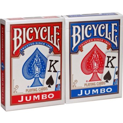 Set de 2 pachete de carti de joc Bicycle Jumbo, un pachet cu model rosu pe spate, iar celalalt pachet cu model albastru pe spate.