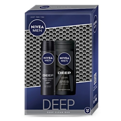 Ingrijirea NIVEA MEN DEEP cu extract de carbon este cadoul ideal pentru barbatii care se autodepasesc atunci cand se simt bine in pielea lor. Cadoul NIVEA MEN DEEP CLEAN DUO contine combinatia perfecta pentru confort zilnic si ingrijire: un gel de dus cu argila microfina derivata natural, alaturi de un deodorant spray care ofera protectie eficienta 48h.