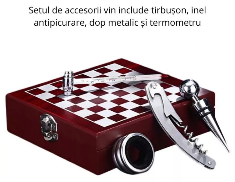 - Setul de accesorii vin include tirbuson, inel antipicurare, dop metalic (mentine prospetimea vinului), termometru (pentru a verifica temperatura perfecta a vinului)