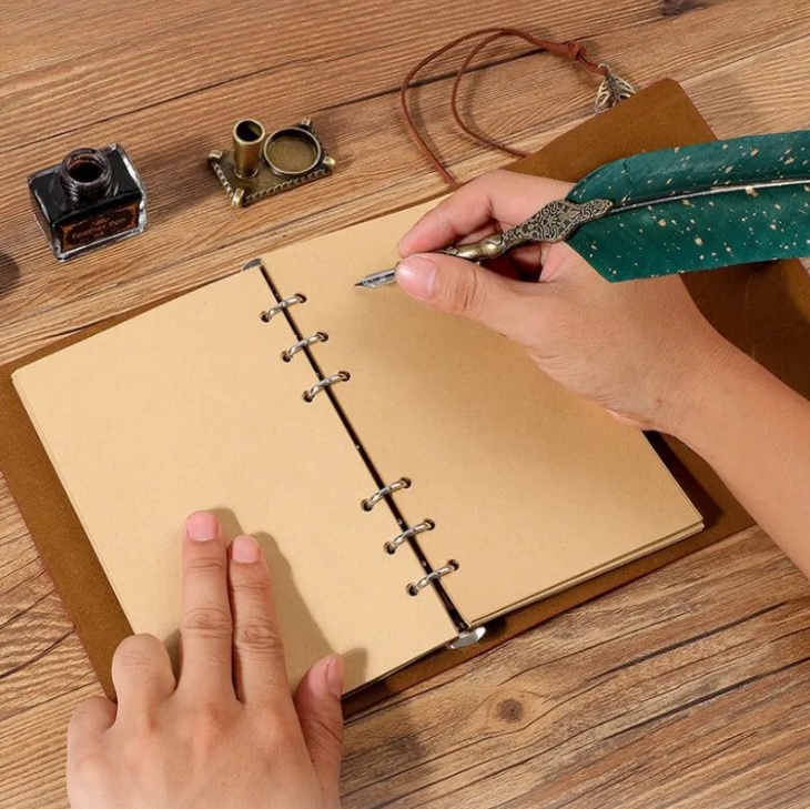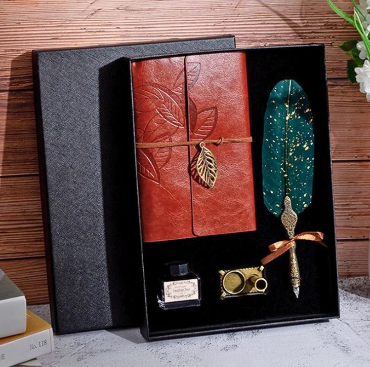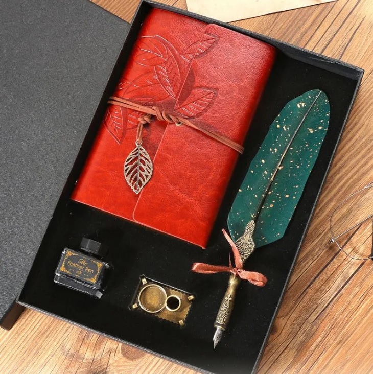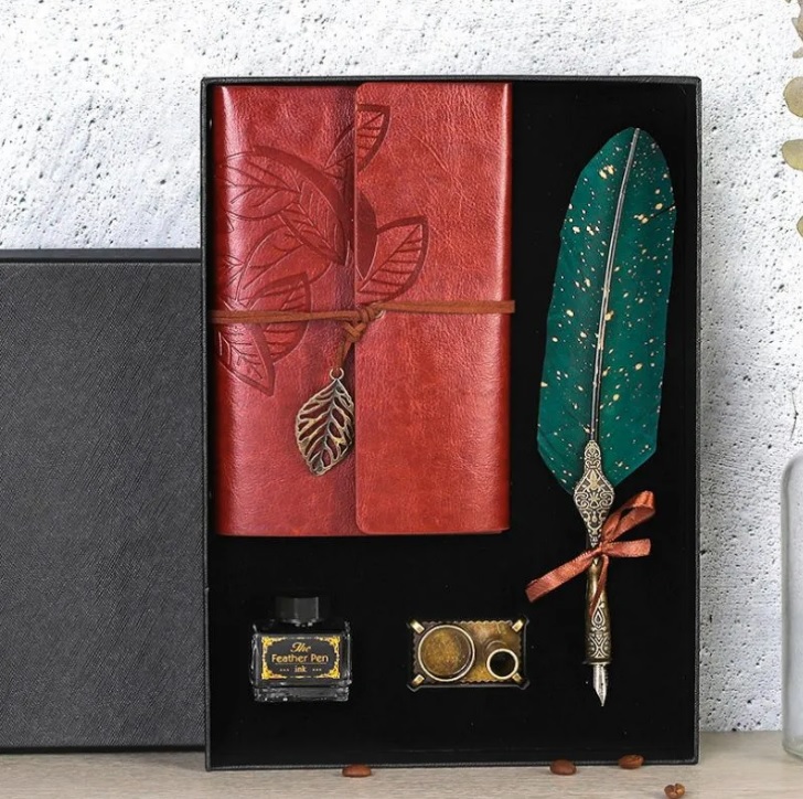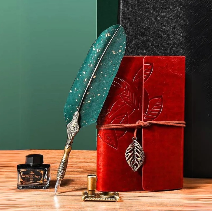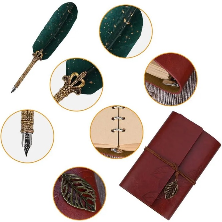 Acest set cadou de caligrafie vintage este creat pentru cei care iubesc sa aduca un strop de magie in fiecare nota sau jurnal. Cu un design rafinat si atent la detalii, acest set include un jurnal elegant, o pana de scris verde, un suport pentru pana si o sticla de cerneala. Jurnalul din piele sintetica, cu pagini detasabile, ofera spatiu generos pentru ganduri si idei, iar pana verde cu detalii aurii adauga un aer nobil si sofisticat oricarui birou.