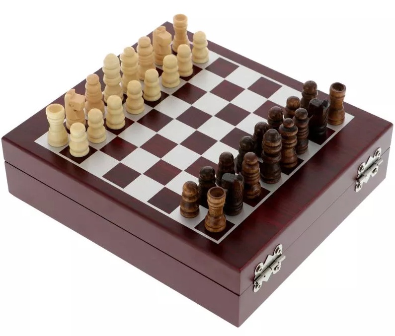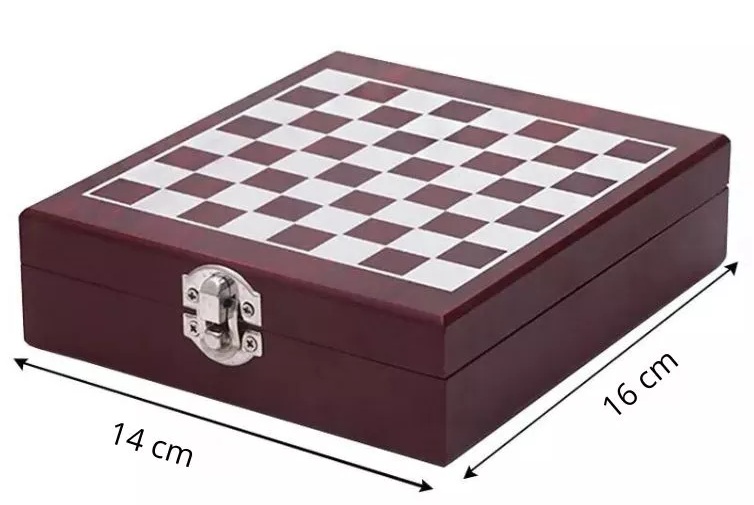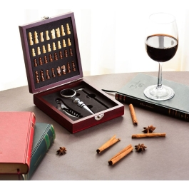 Aceasta caseta cocheta cu tabla de sah pe exterior ascunde in interior toate piesele necesare unui joc autentic de sah si ceva in plus: un set de accesorii pentru vin, foarte practice.