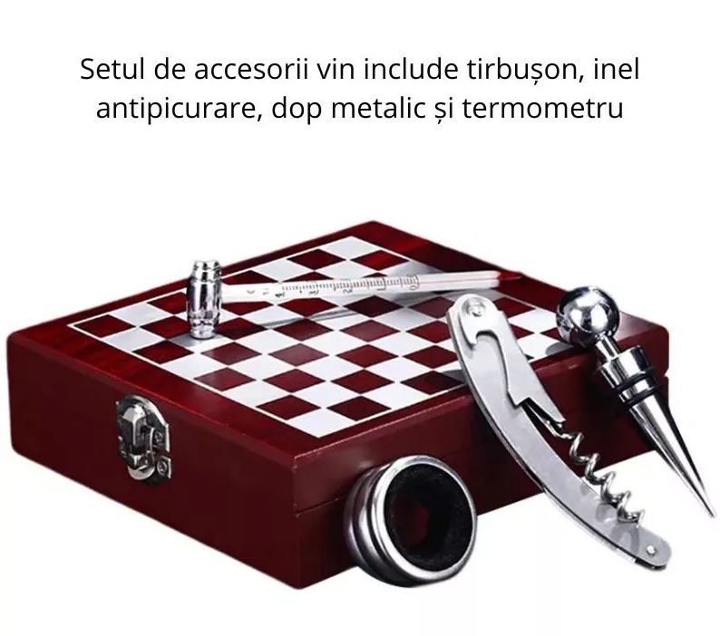 Setul de accesorii vin include tirbuson, inel antipicurare, dop metalic (mentine prospetimea vinului), termometru (pentru a verifica temperatura perfecta a vinului)