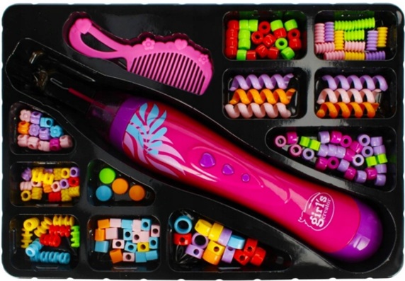 Setul include o mașină de împletit păr, margele de culori mixte și un pieptene de păr.