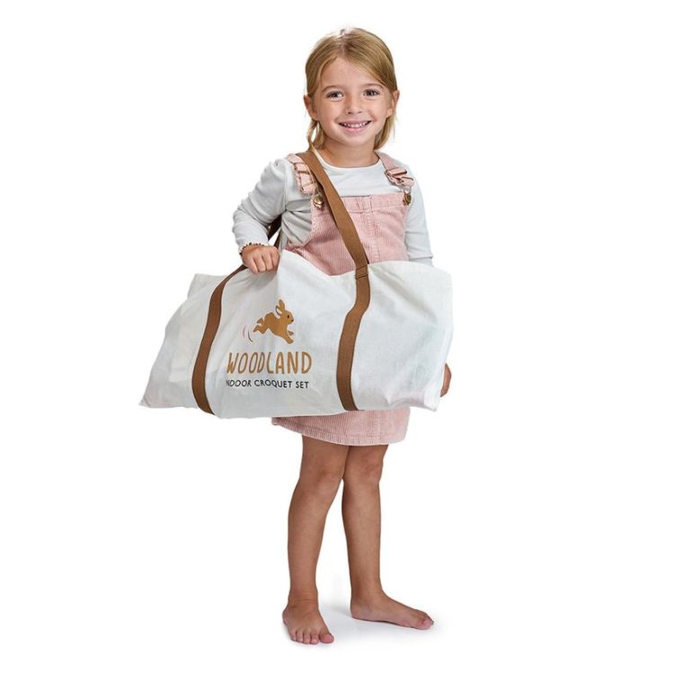 Setul de croquet de interior Woodland este ambalat intr-o geanta practica din panza imprimata, cu maner pentru umar.