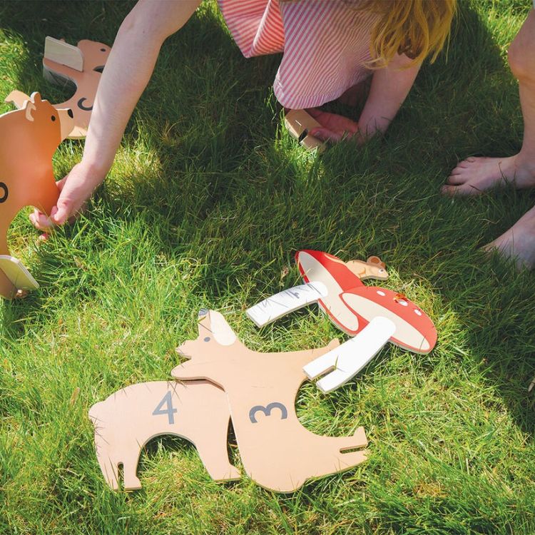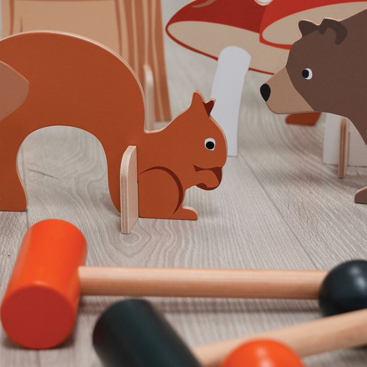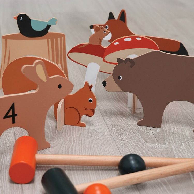 Contine 6 porti de croquet colorate si ilustrate cu tematica padurii, 2 ciocane din lemn si 2 bile de lemn vopsite. Vei descoperi un ursulet, o veverita, o vulpe, un iepuras, un trunchi de copac cu pasare si o ciupercuta cu un soricel – toate pot fi asezate astfel incat sa creeze o poienita de poveste. Jocul este perfect pentru 2 jucatori – loveste mingea prin porti si aduna punctele indicate pe spatele fiecarei piese!
