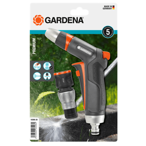 Setul de curatare Premium GARDENA este potrivit atat pentru curatare, cat si pentru irigare. Daca fluxul de apa trebuie sa fie continuu, puteti bloca declansatorul. Oboseala mainii este astfel impiedicata. Complet cu mufa cu stop Premium pentru furtun.