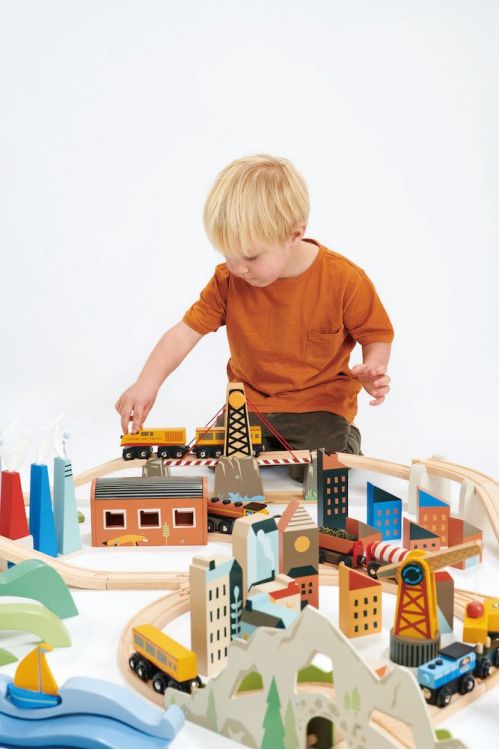 Set de tren cu vedere la munte, din lemn premium. O varianta moderna cu adevarat magnifica a garniturii de tren traditional. 58 de piese pentru a va crea propriul proiect de fiecare data, in care veti explora peisaje industriale, urbane, respectiv locatii de vacanta.
