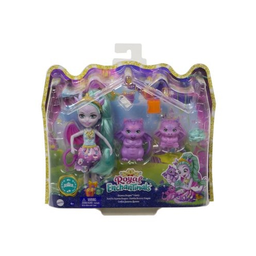 Acest set de familie Royal Enchantimals include papusa Deanna Dragon, 3 prieteni dragoni si 4 accesorii. Pentru joaca de-a moda, papusa Deanna Dragon este imbracata cu o coroana aurie, o fusta detasabila si pantofi. Cei mici vor adora aripile sale de dragon fantastice, coada si urechile care se asorteaza cu prietenii sai. Cu accesorii precum o invitatie si o cutie cadou, aceasta familie de dragoni este pregatita sa participe la balul regal Enchantimals! Copiilor le va placea sa puna in scena legatura speciala de familie intr-un mod maiestuos. Si cu 4 personaje in aceasta colectie de familie Enchantimals, este si mai multa distractie pentru cel mic! Culorile si decoratiunile pot varia. Papusile nu isi pot mentine pozitia fara sprijin.